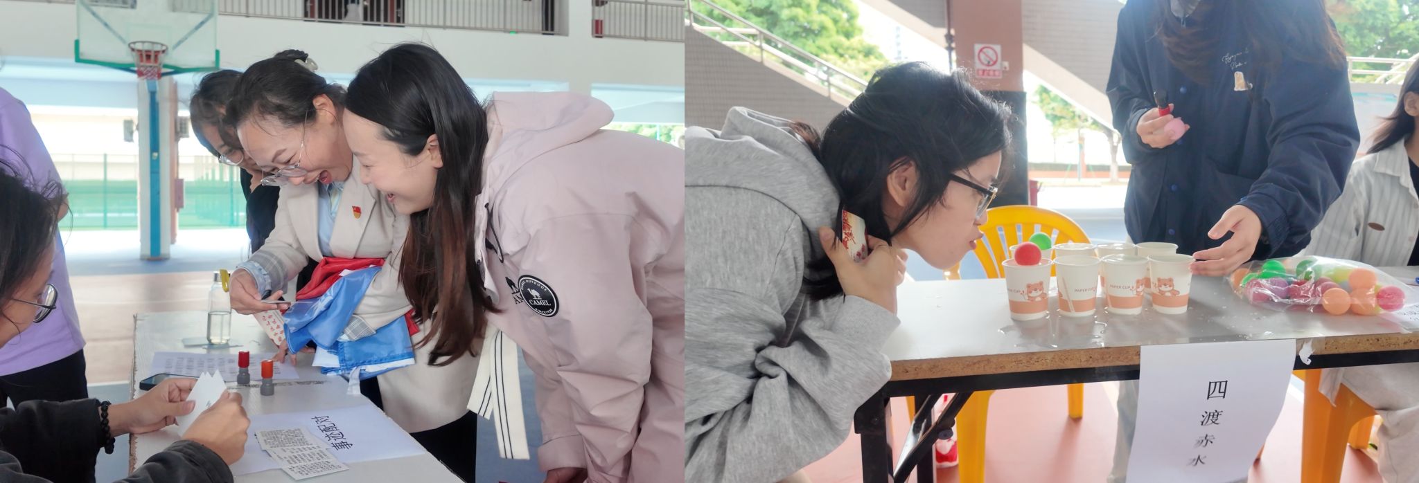 活动以“趣享红文化,青春绽芳华”为主题,精心设计了七大红色主题游戏摊位,通过积分打卡形式引导师生在互动中学习党史知识。现场设置的“党史知识大闯关”“红色歌曲你来唱”“红色emoji猜猜乐”等趣味项目,将红色文化融入闯关挑战、知识竞答、情景模拟等环节。例如,“英雄人物事迹配对”游戏中,参与者需通过翻牌配对英雄事迹,既考验记忆力又深化了对革命先辈的敬仰;“四渡赤水”“炸碉堡”等创意游戏,以轻量化、趣味化形式还原党史经典场景,让原本抽象的红色精神变得看得见、摸得着、能体会。师生们手持积分卡穿梭于各摊位,在欢声笑语中完成党史知识学习与精神洗礼。