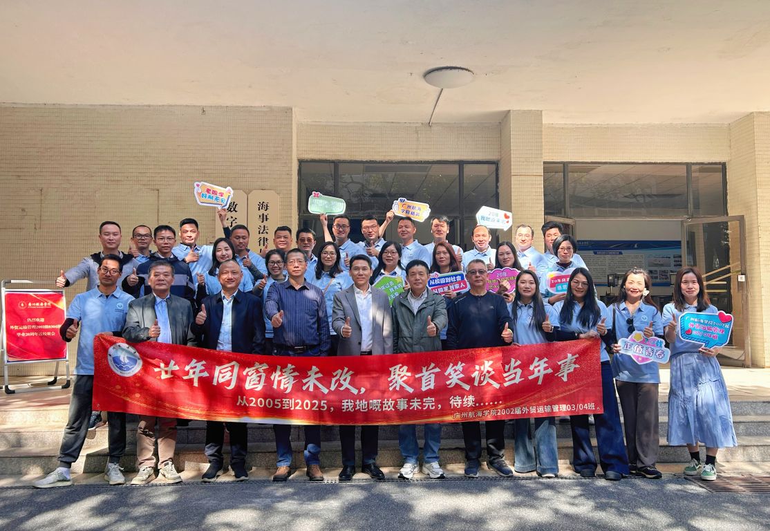 全力协助20周年校友返校聚会。11月29日,2002届外贸运输管理03/04班校友迎来毕业20周年重聚。学院在B2航运楼205会议室设立专属接待点,师生围坐座谈,追忆课堂求学、码头实训的青涩岁月,畅谈行业发展与人生感悟;随后共同重游校园,探访承载青春记忆的教室与实训场,在北区足球场开展互动竞技,重拾同窗默契。现场悬挂“廿年同窗情未改,聚首笑谈当年事”的横幅,定格下这份跨越二十载的深厚情谊,相聚瞬间被悉心记录,为校友留存珍贵回忆。